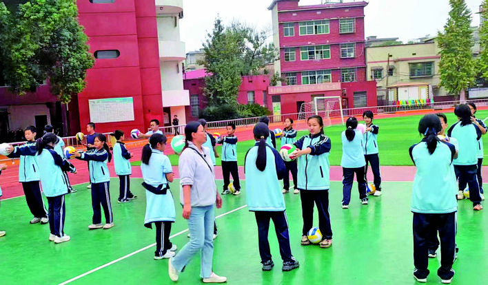 在岳塘區(qū)湘鋼二中的操場上,總能看到一個充滿活力的身影。她或帶隊奔跑跳躍,身姿矯??;或俯身指導排球動作,神情專注。