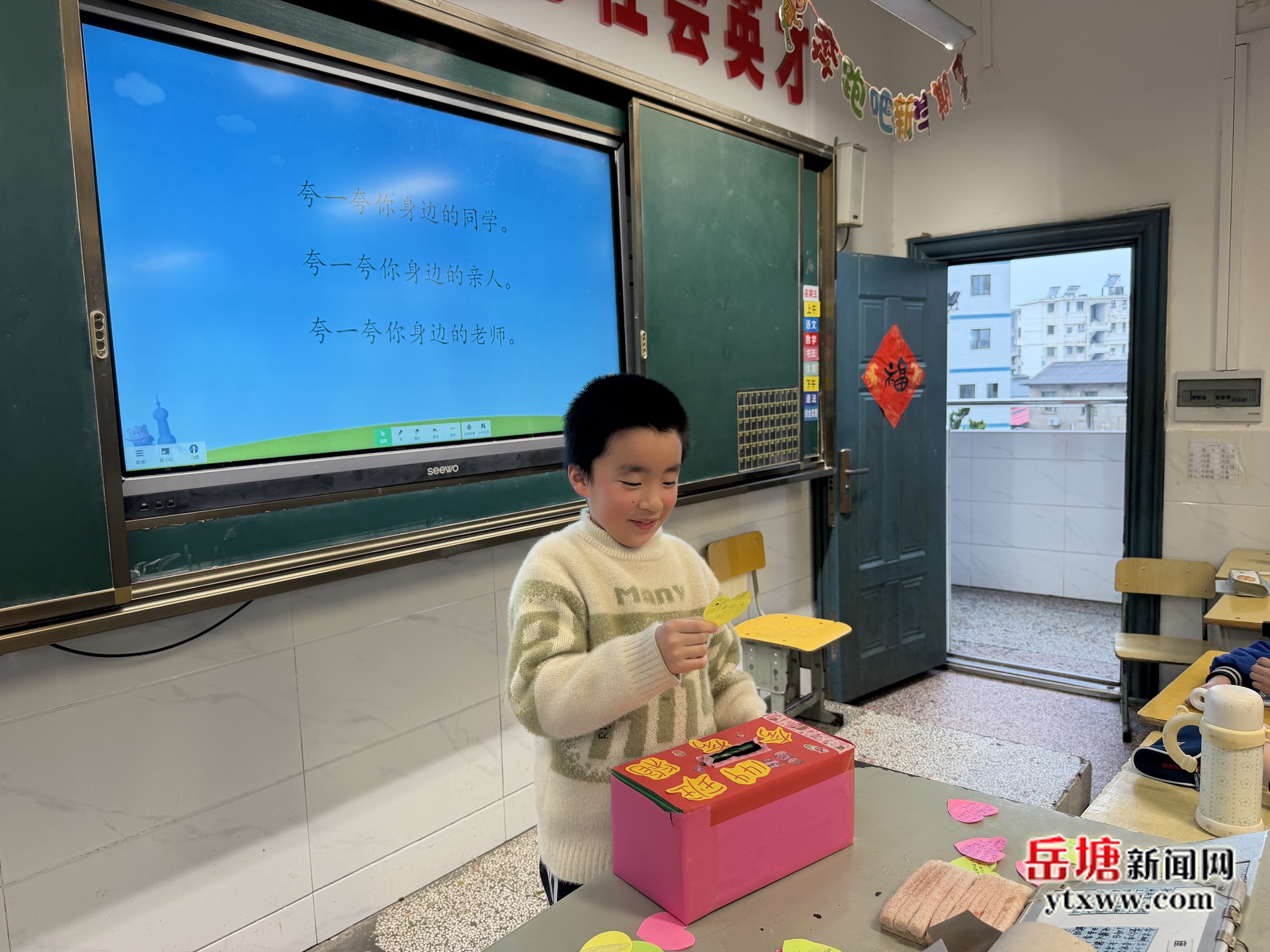 在溫馨而熱烈的氛圍中,同學(xué)們拿起彩色愛心便利貼,一筆一畫寫下對身邊人的真誠夸贊,有對老師諄諄教誨的感恩,有對同學(xué)樂于助人、勤奮向上的認可,也有對親人默默付出的感念。一句句質(zhì)樸真摯的話語,承載著最純粹的善意,被孩子們小心翼翼地投入“夸夸箱”。